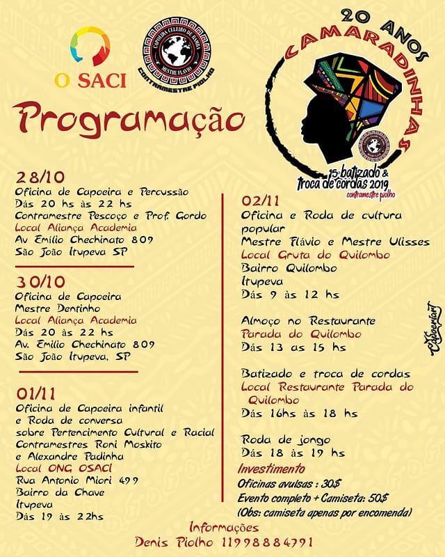 O evento teve início no último dia 28, com Oficina de Capoeira e Percussão. Nesta sexta (1), as atividades começam às 19h, na ONG O Saci, na Rua Antonio Miori, 499 (Bairro da Chave), com Oficina de Capoeira Infantil e Roda de conversa sobre Pertencimento Cultural e Racial com os Contramestres Roni Moskito e Alexandre Padinha.