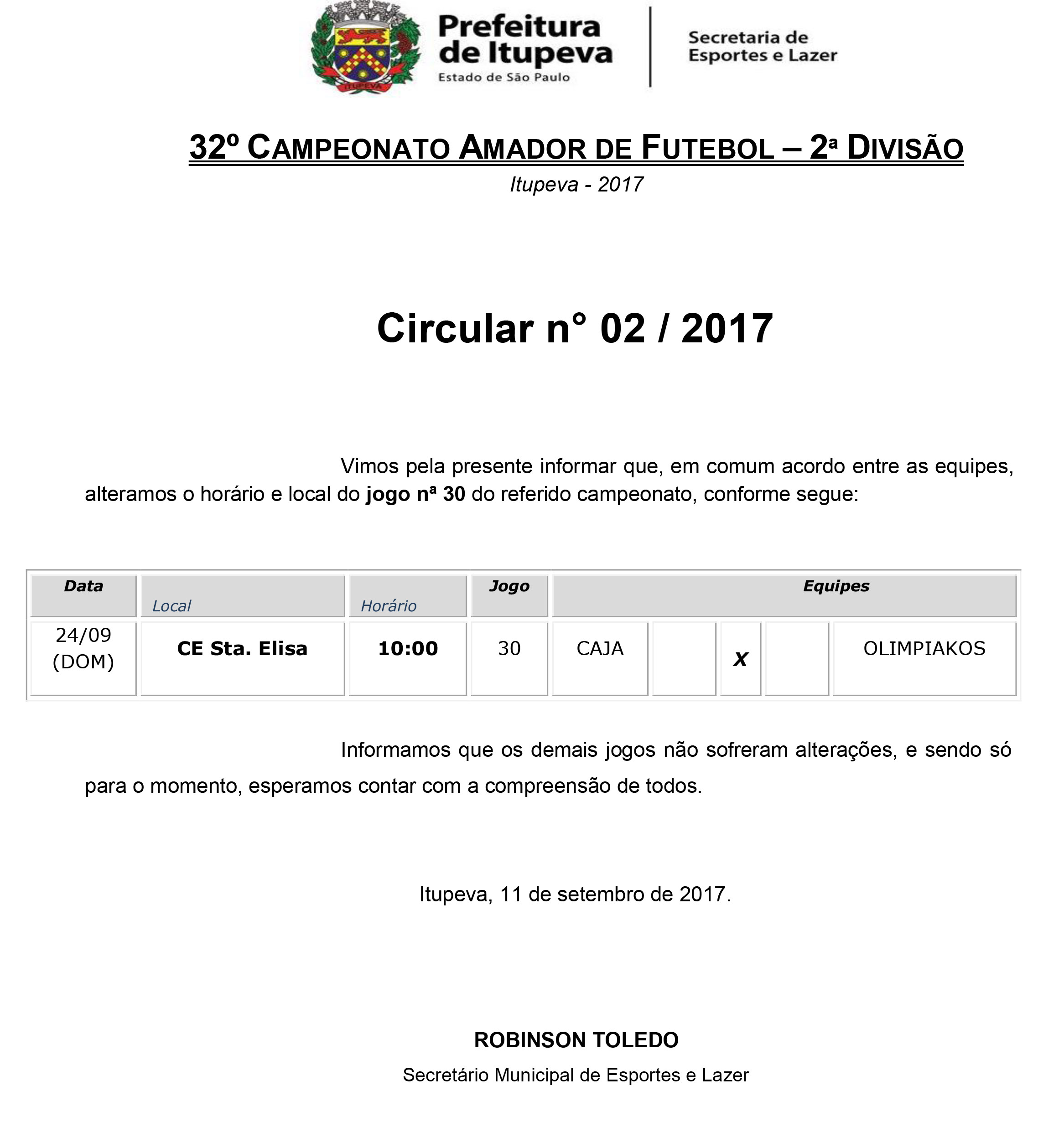 A tabela da segunda divisão também sofreu alteração, e o jogo entre Caja e Olympiakos desse domingo (24) será realizado às 10h, no CE Santa Elisa, e não às 15h.