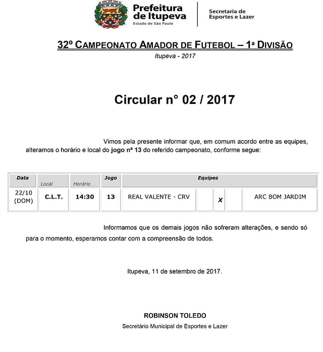 Na primeira divisão, o jogo entre Real Valente – CRV e Bom Jardim, que estava marcado para esse domingo (24), foi transferido para o dia 22 de outubro, um domingo, às 14h30, no Centro de Lazer do Trabalhador, o Campão.