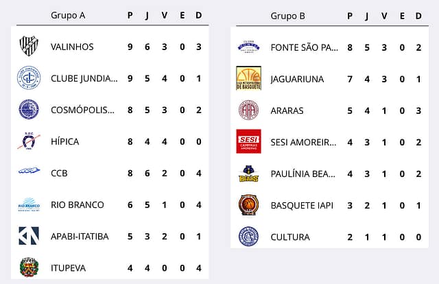 Atualmente, Itupeva ocupa a última posição no grupo A, que tem ainda, por ordem de classificação, Valinhos, Clube Jundiaiense, Cosmópolis, Hípica Campinas, CCB, Rio Branco e Apabi-Itatiba. No grupo B, o Fonte São Paulo é líder, seguido de Jaguariúna, Araras, Sesi Amoreiras, Paulínia Bears, Basquete Iapi e Cultura.