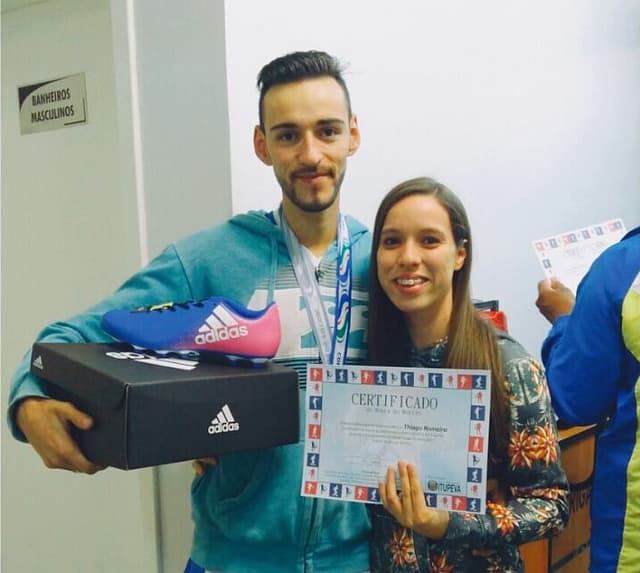 Ao fim da homenagem, o atleta Thiago Romera ainda recebeu mais uma surpresa, dessa vez de sua namorada, que o presenteou com uma bela chuteira.