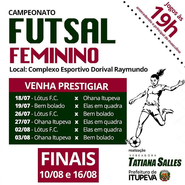 Começa nesta quinta-feira (18), o Festival de futsal feminino, promovido pela presidente da Câmara, Tatiana Salles, e organizado pela Prefeitura por meio da Secretaria de Esportes e Lazer.