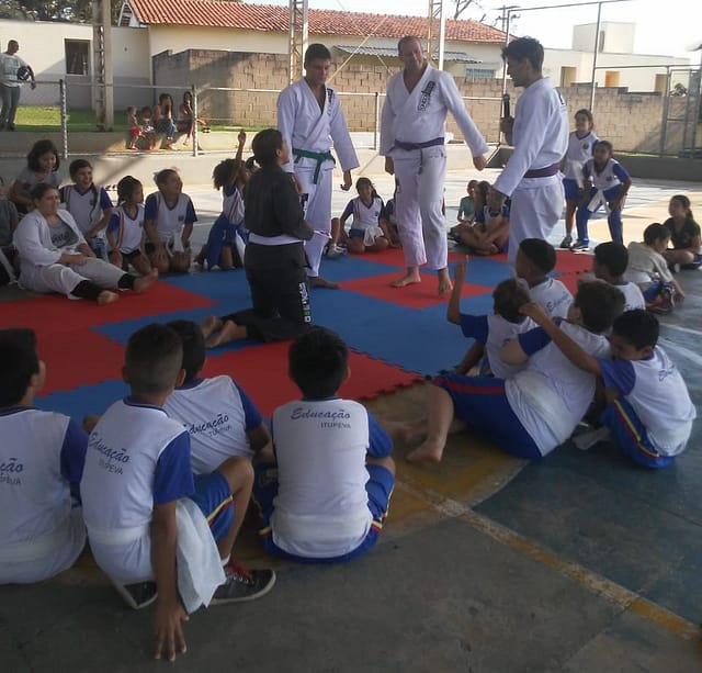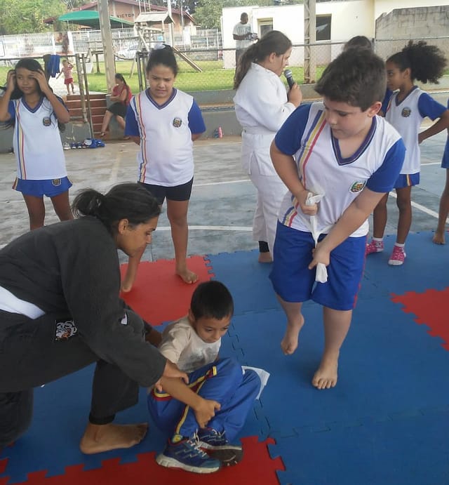 “Conseguimos organizar melhor a oficina e hoje finalizamos com um lindo festival de lutas. As crianças receberam uma faixa branca como instrumento simbólico que caracteriza as artes marciais para motivá-las. Os instrutores e atletas do jiu-jitsu colocaram as faixas nas crianças e elas aos pares tinham seu momento em dupla para exercitarem o que aprenderam e trabalhar uma técnica de imobilização. Foi muito proveitoso e mais uma vez emocionante! Tivemos a presença de vários pais que ficaram do início ao fim prestigiando. Foram momentos de profundos aprendizados e transmissão de valores”, comentou a professora de educação física, Géssica Rinaldi, que organizou a Oficina, com apoio da diretora da escola, Yara Burgos.