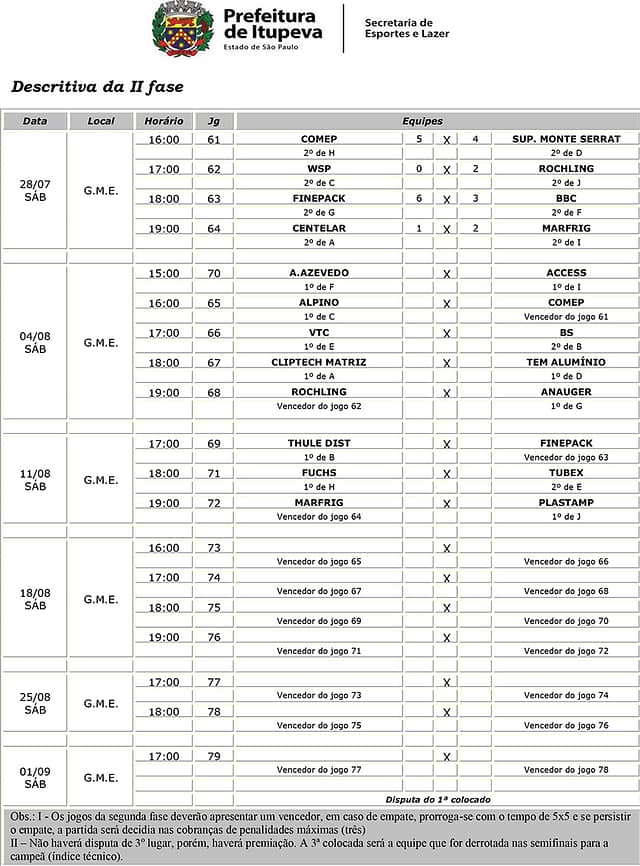 Às 15h, A. Azevedo e Access jogam. Às 16h, Alpino enfrenta a Comep. Em seguida, 17h, o confronto é entre VTC e BS. Às 18h, jogam Cliptech Matriz e Tem Alumínio. Encerram a rodada Röchling e Anauger, às 19h.