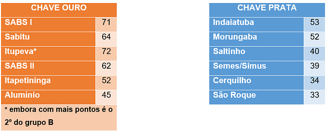 Depois da última rodada, Itupeva terminou em segundo, com 72 pontos, atrás de Semes/Santa Rita, com 78. SABS II, que venceu Itupeva, vem em seguida, com 62; à frente de Indaiatuba, com 53, e Morungaba, com 52.