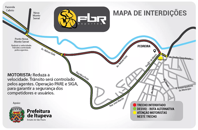 Por conta da disputa, alguns pontos do município estarão interditados durante o período da prova, conforme segue: