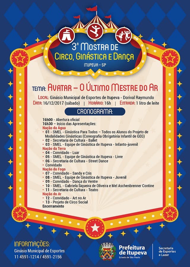 A Prefeitura de Itupeva, por meio da secretaria de Esportes e Lazer, promove no próximo dia 16, sábado, a 3ª Mostra de Circo, Ginástica e Dança, no ginásio de esportes Dorival Raymundo, a partir das 16h.