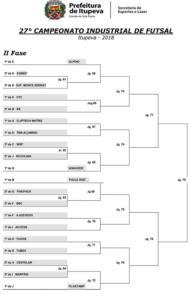 Na última rodada do 27º Campeonato Industrial de Futsal, disputada no sábado (21), foram definidos todos os classificados da fase de grupos e, nesta terça-feira (24), a Secretaria de Esportes e Lazer divulgou a tabela completa para a fase eliminatória.
