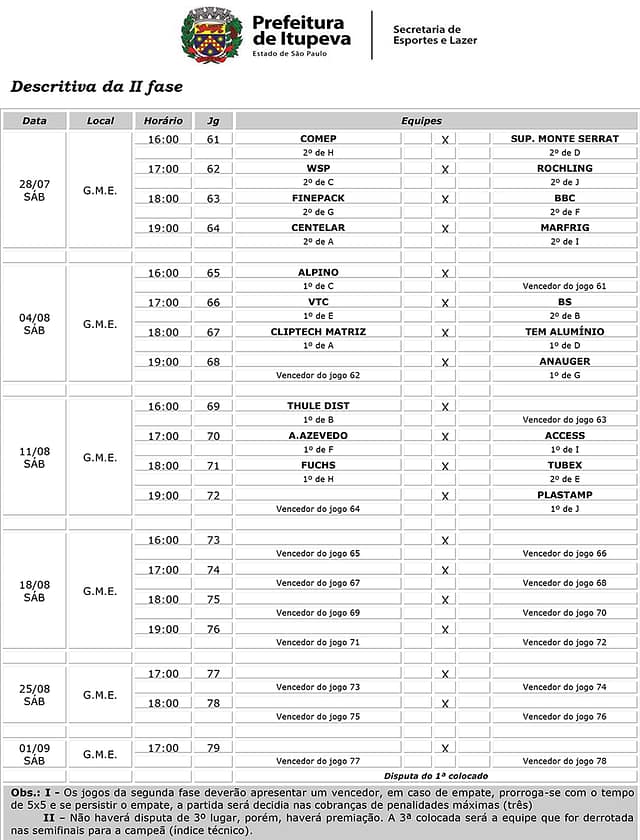 Os confrontos começam já neste sábado (28), com Comep e Supermercado Monte Serrat se enfrentando às 16h. Em seguida, às 17h, jogam WSP e Röchling. Finepack e BBC se enfrentam às 18h. Encerram a rodada Centerlar e Marfrig, àr 19h. Todas as partidas são disputadas no ginásio de esportes Dorival Raymundo.