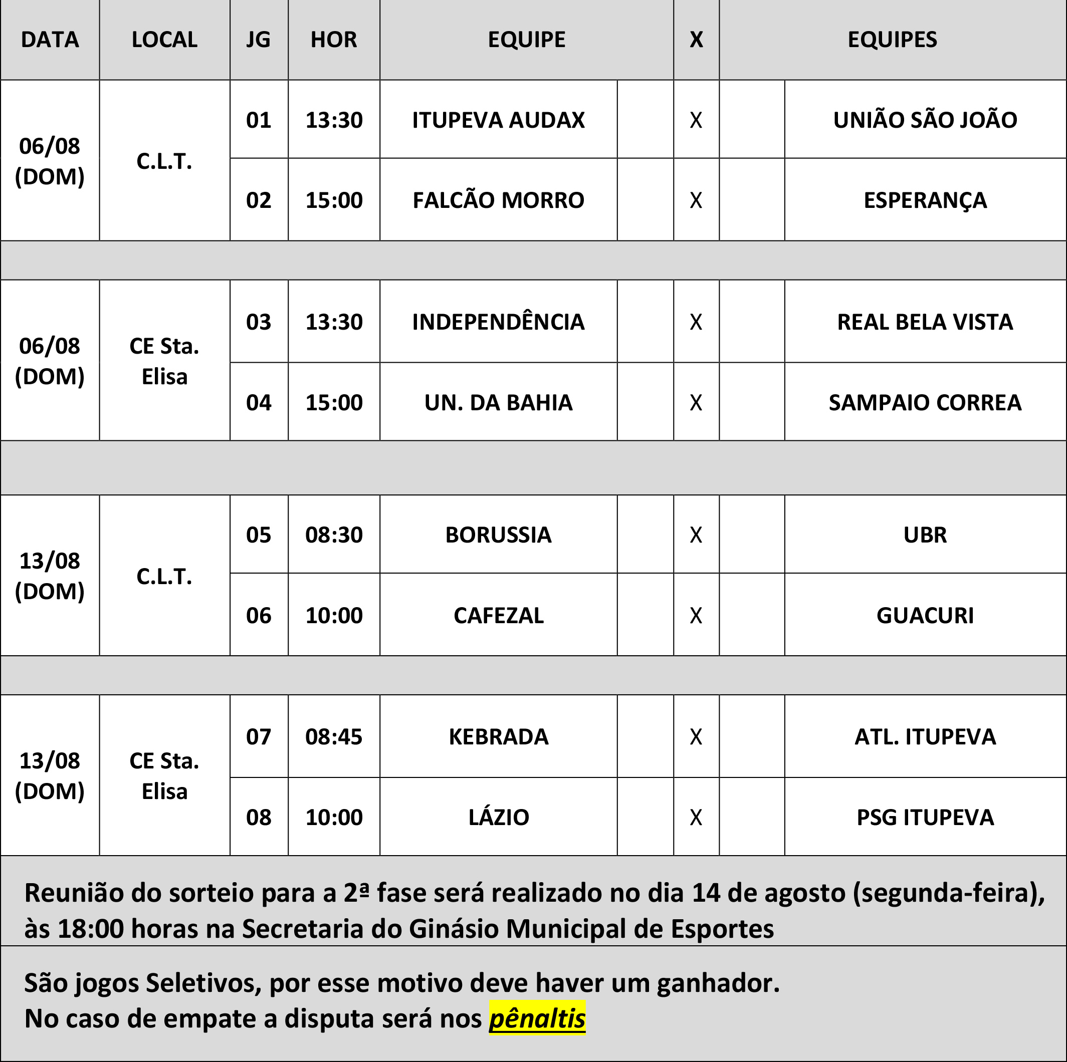 A reunião do sorteio para a 2ª fase será realizada no dia 14 de agosto (segunda-feira), às 18h, na Secretaria do Ginásio Municipal de Esportes.